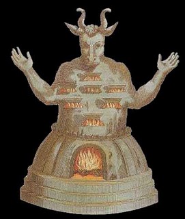 Moloque era um deus de aparência horrenda, sendo representado como um homem com cabeça de boi, todo esculpido em bronze e com uma cavidade aberta no abdômen. Seus sacerdotes aqueciam sua estátua de tal modo que ela se tornava vermelha, trazendo assim a atenção de seus adoradores. Eles colocavam as crianças, geralmente seus filhos primogênitos, sobre as mãos estendidas da estátua do deus, e depois as atiravam dentro de seu abdômen incandescente, onde eram devoradas pelas chamas. Para não provocar arrepios nos assistentes, os iníquos sacerdotes de Moloque tomavam o cuidado de mandar soar trombetas e rufar tambores, abafando assim, no ruído de uma música infernal, o gemido dos pobres inocentes.