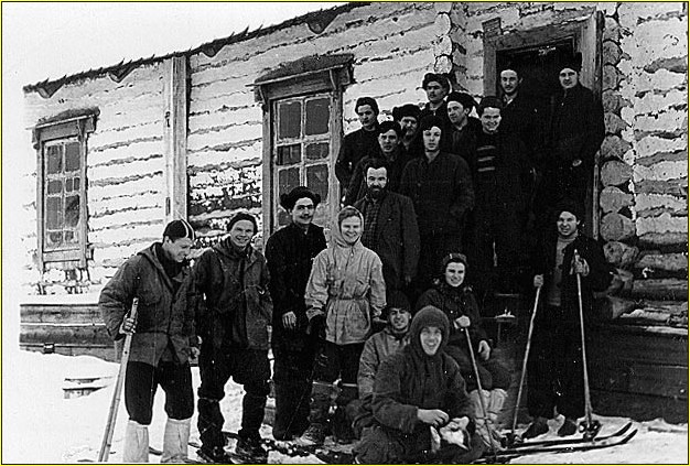 | Observado por Igor Dyatlov, Yuri Yudin abraça Lyudmila Dublinina enquanto prepara-se para deixar o grupo devido a problemas de saúde |