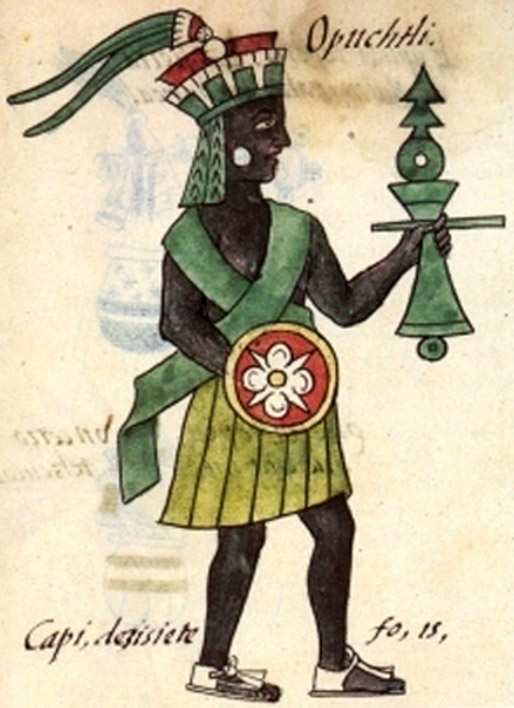 Opochtli foi um deus asteca da caça e da pesca, adorado por aqueles que ganhavam a vida nos lagos e pântanos no Vale do México, especialmente na parte sul da bacia. O Codex Florentius representa o deus como um homem negro usando uma coroa de plumas e segurando um arpão em sua mão esquerda e um escudo em sua mão direita.