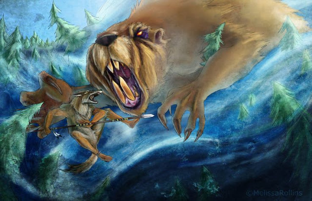 Conforme lutavam, os dois remodelavam a região criando canais e desfiladeiros e eventualmente desviando toda a água do lago para outro local. Wishpooshi era monstruoso, e por um momento Coyote ficou assustado com sua demonstração de poder. Mas como era o mais astuto de todos os animais, Coyote arquitetou um plano. Transformando-se em um galho de árvore, Coyote flutuou entre os peixes até Wishpooshi o engolir. Voltando à sua forma natural, Coyote pegou uma faca e cortou os tendões no interior do castor gigante. Wishpooshi deu um grande grito e depois pereceu. Vencedor, Coyote usou então a carcaça de Wishpooshi para criar as tribos de homens.